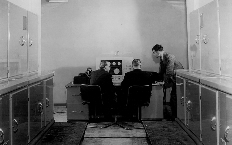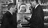 Dai Edwards and Tommy Thomas using the Manchester Mark 1 computer.