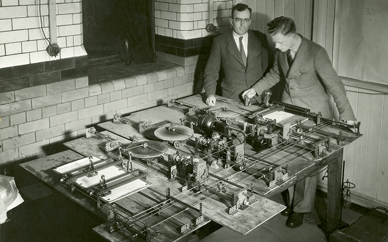 1934: Professor of Mathematics Douglas Hartree and PhD student Arthur Porter built the first British Differential Analyser - a mechanical analogue computer used to integrate differential equations such as the Hartree equations in computational chemistry. (Image courtesy of the Science Museum group).